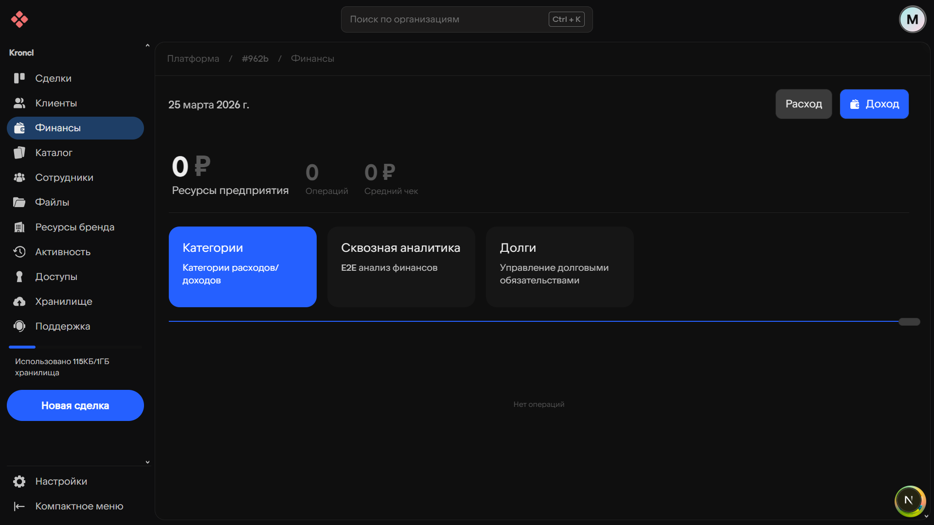 При открытии раздела «Финансы» (левая боковая панель пространства организации) вы увидите главное меню управления операциями. Здесь же находится история транзакций (операций), баланс предприятия и разделы навигации: категории, аналитика, долговые обязательства.