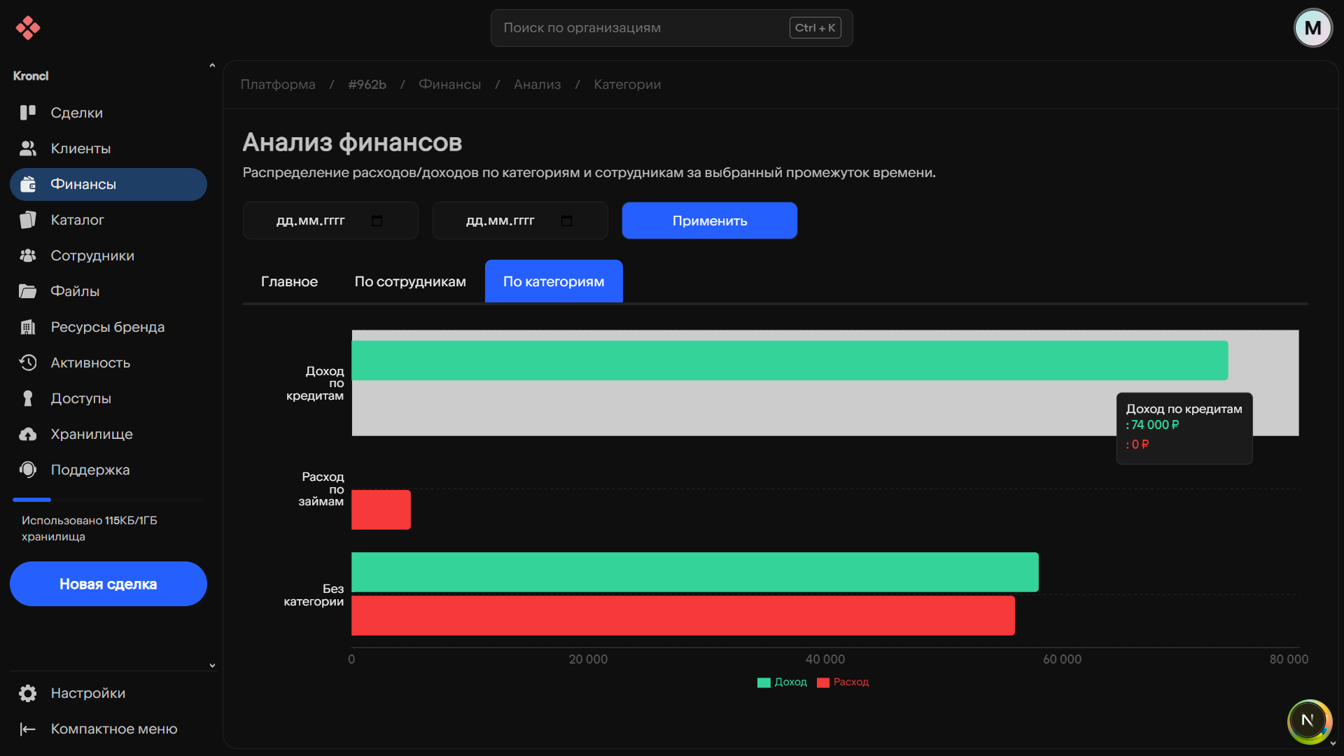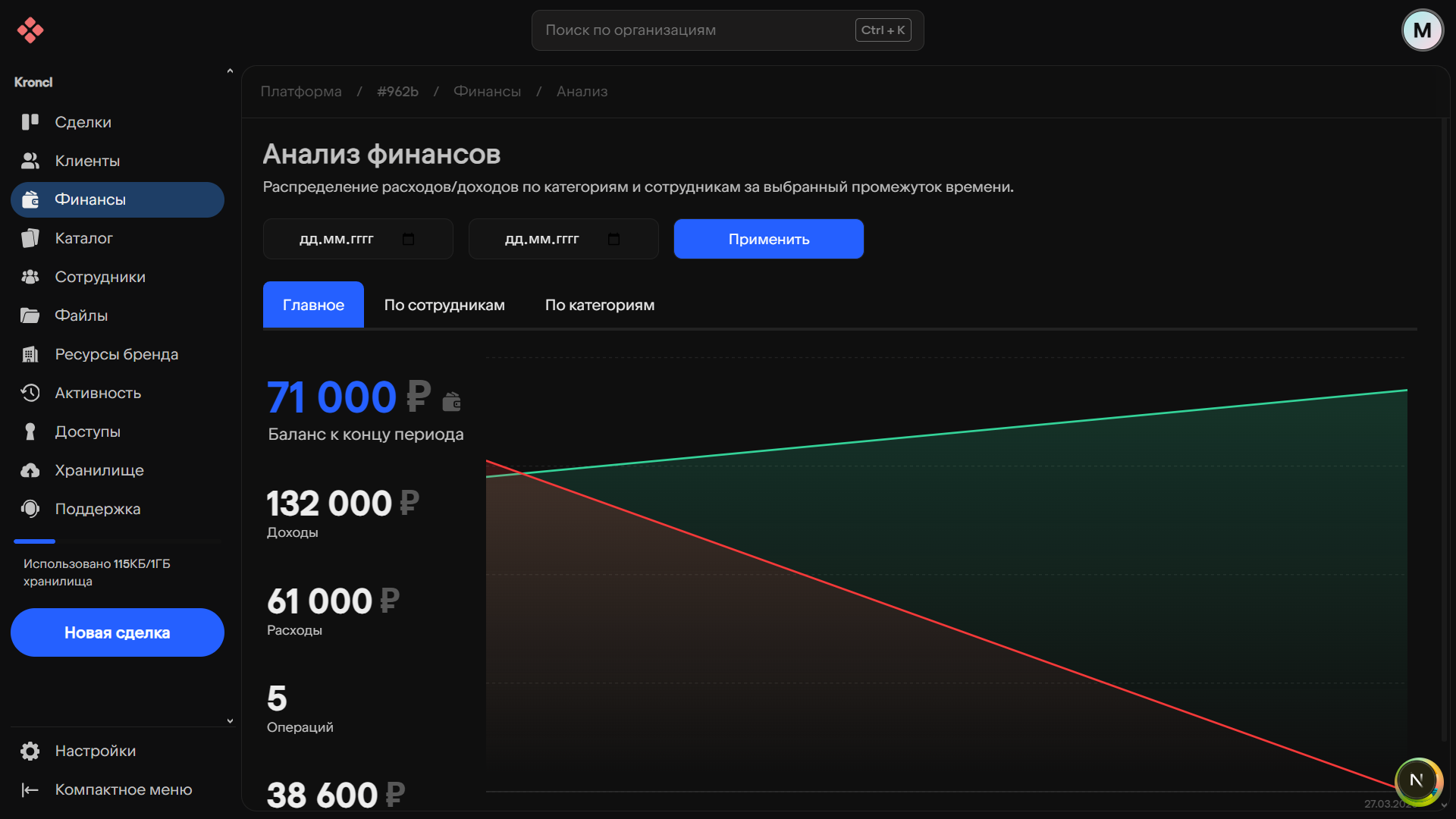 После клика на нужную секцию произойдет загрузка аналитики финансов.