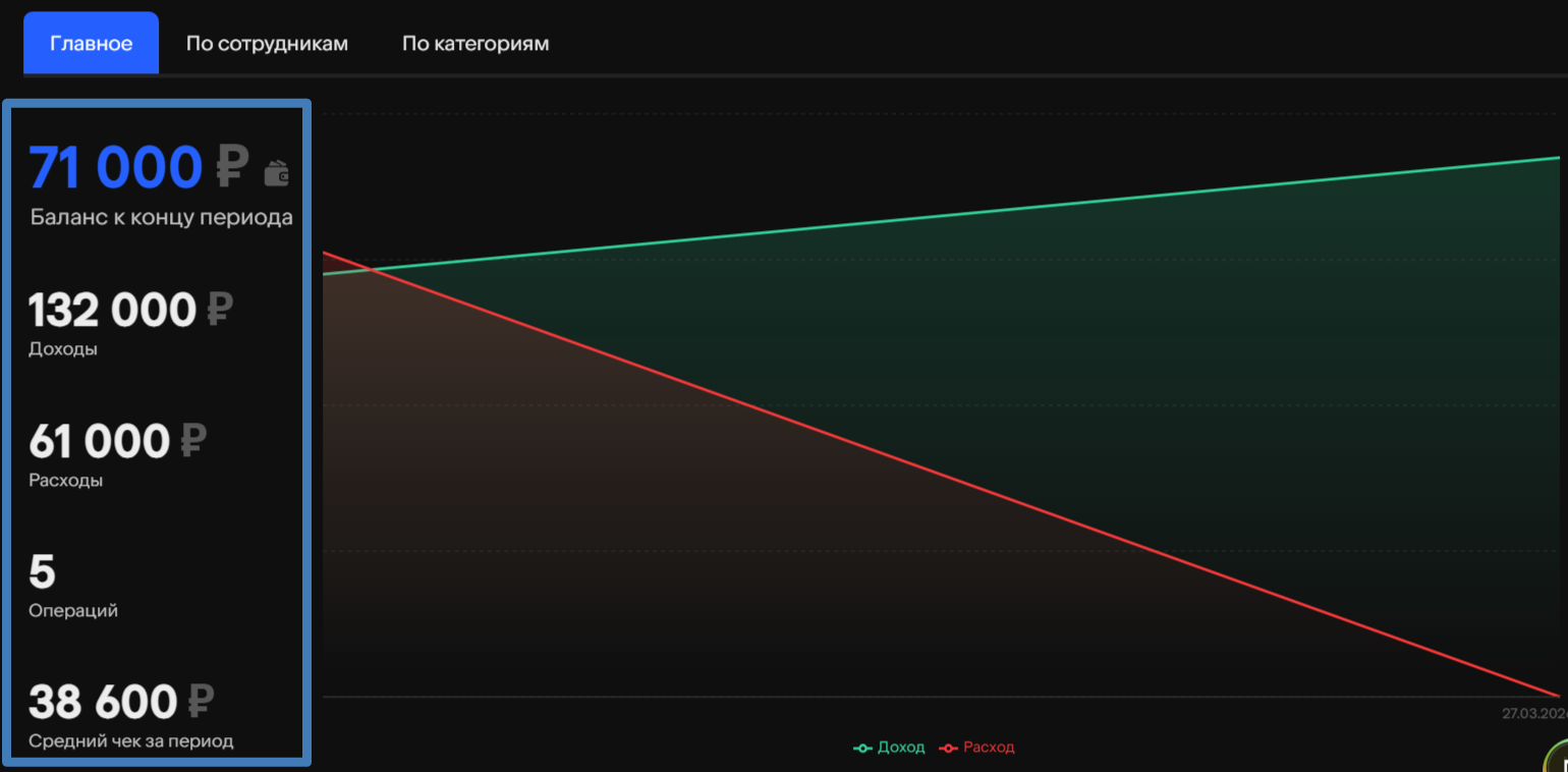 Подраздел «Главное» аналитики дает представление о базовых счетчиках финансов и выстраивает динамику трат/доходов с промежутком в 1 день.